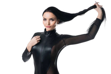 Sexy woman in leather bodysuit and with long hair in studio