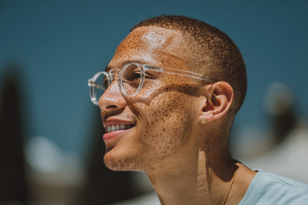 Young man wearing glasses is smiling outdoors under bright sunlight, showing a joyful expression against a clear blue sky.