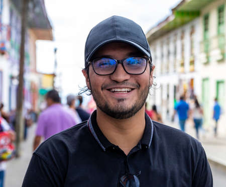 Portrait laughing Latino young man with cap and eyeglasses in a street of a town in Filandia Quindio