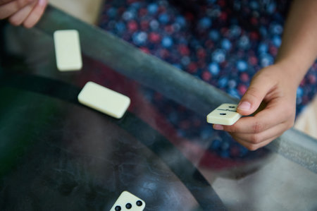 Family entertainment for a fun leisure game of dominoes. The young man's hand holds a domino in his hands
