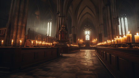 A breathtaking digital panorama of the interior of an old gothic church, illuminated only by the flickering light of candles. The image was created using advanced ray tracing techniques, giving it a cinematic quality that draws the viewer in and creates a sense of otherworldly mystique.