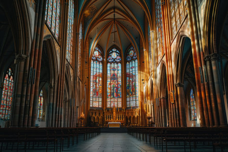 Majestic cathedral interior with high ceilings and intricately stained glass windows. Historical and religious architecture