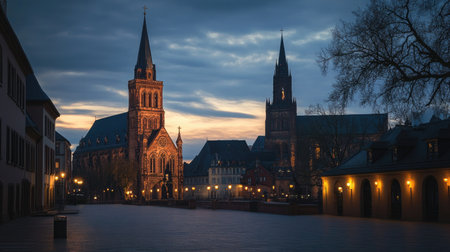 A twilight view of the Mainz Cathedral, with the cathedral's majestic silhouette standing tall against the evening sky, and warm lights highlighting its intricate details.