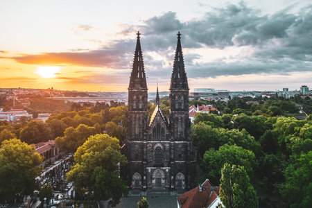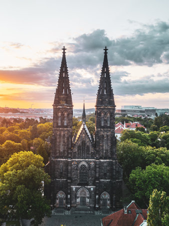 The morning light casts a warm glow on Vysehrad Basilica of St. Peter and St. Paul, illuminating its twin towers and surrounding greenery in the heart of Prague, Czechia.
