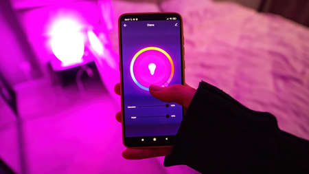 Female hand holding a smartphone with illumination controll app. Purple light in the room
