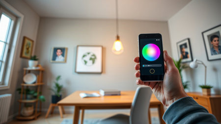 Home Lighting App Control. Person using smartphone color wheel interface to adjust pendant light in modern home office setting.