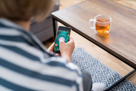 Back view woman sitting on the couch and holding smartphone with active online mobile application with Healthy diet program. New Start of a healthy lifestyle, weight loss concept. Selective focus.