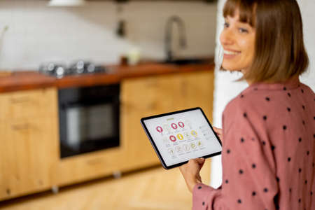 Woman holds a digital tablet with running mobile application for smart home, standing in kitchen of modern apartment. Controling smart devices with a digital tablet