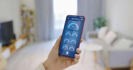 Person holding smartphone, controlling the smart home devices in a modern living room, showcasing the seamless integration of technology into everyday life.
