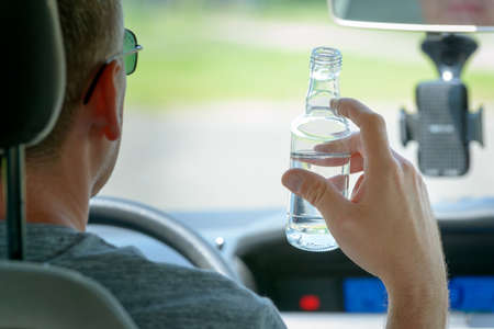 Driver driving a car with a bottle of alcohol in his hands close-up.