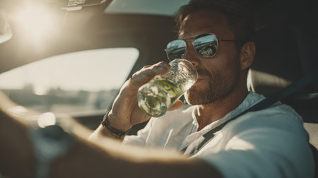 A man sits in a car, taking a drink from a container while driving on a sunny day, illustrating the risks of drinking and driving.