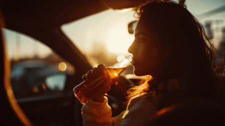 A woman drives while taking sips from a bottle of alcohol as the sun sets in the background. She appears focused on the road ahead.