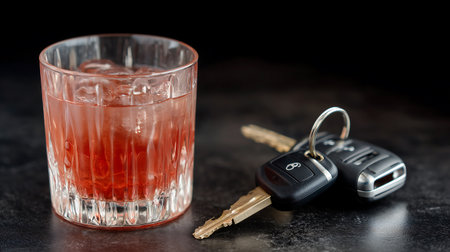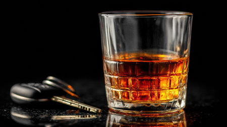 A glass filled with alcohol sits next to car keys on a dark surface. This captures the dangers of drinking and driving clearly.