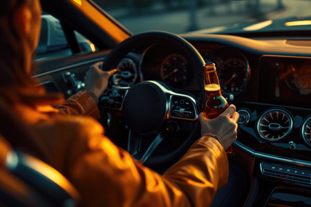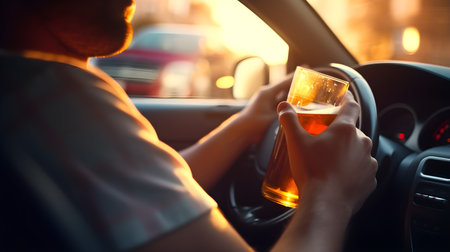 An unrecognizable man drinking beer while driving car. Concepts of driving under the influence, drunk driving or impaired driving