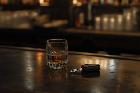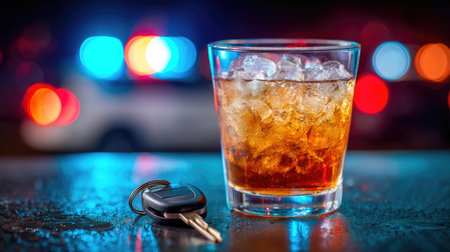 Glass of Whiskey with Car Keys and Police Lights Bokeh Background