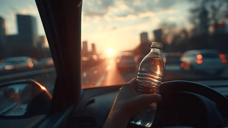 Person drinking water while driving through city traffic at golden hour, holding a clear bottle to stay cool and refreshed during a hot summer commute