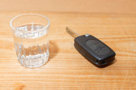 car key with glass of vodka on desk