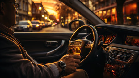 Drunk man driving a car with a glass of beer in his hand.