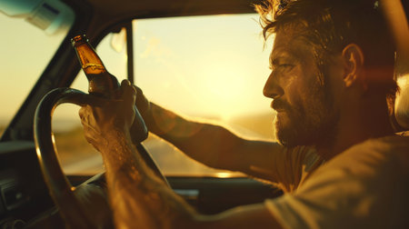Dangerous behavior young man driving under the influence with beer bottle in hand