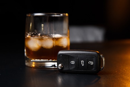 Drunk driving concept - car keys in the foreground with glass of whiskey