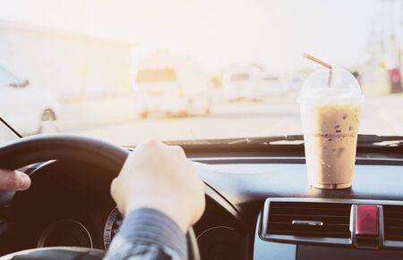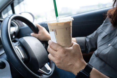 Bangkok, Thailand - December 1, 2021 Asian lady holding ice coffee in car dangerous and risk an accident.