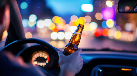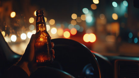 Drunk Driving at Night with Bottle of Alcohol in Hand. High quality photo