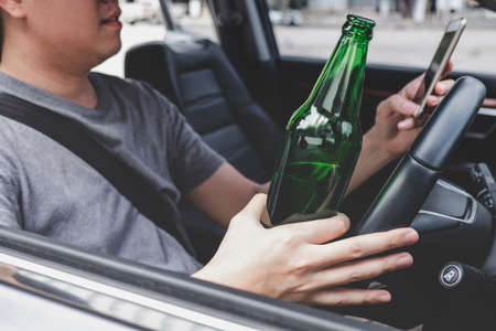 Young asian man drives a car with drunk a bottle of beer and using smartphone behind the wheel of a car.