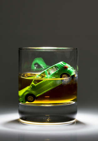 Drinking and driving concept with a motor vehicle collision and glass of whiskey