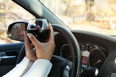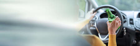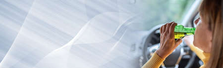 Woman drinking alcohol while driving; panoramic banner