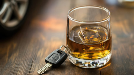 A glass of whiskey sits next to a car key fob on a wooden table, symbolizing the dangers of drinking and driving.