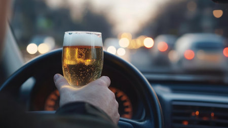 Blurred image of a man driving with a beer glass in hand, conveying the life-threatening danger of drunk driving.