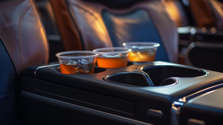 Four plastic cups with ice and drink in car cup holders