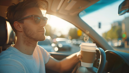 Urban lifestyle concept young driver multitasking with coffee cup, steering car in modern city