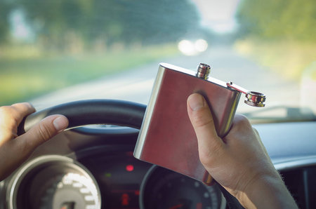Drunk driver drinking an alcohol from flask and driving a car.