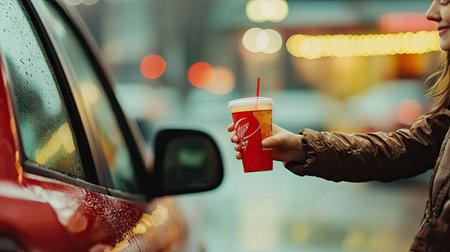 A minimalist photo of a hand extending a drink to a woman seated in her car at a fast-food drive-thru.