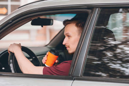 Young man sitting in the car while drinking coffee. Transport, lifestyle, people concept.