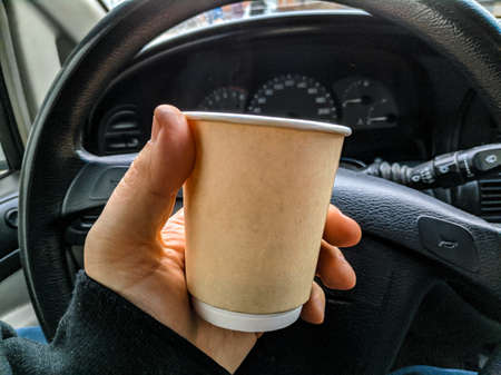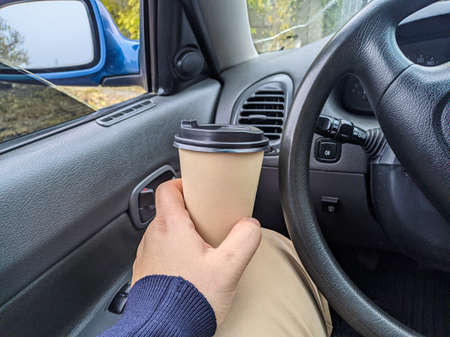 coffee in the car. Man holding coffee paper cup in car. coffee is a friend of traveler. transportation and vehicle concept - man drinking coffee while driving the car. Coffee break