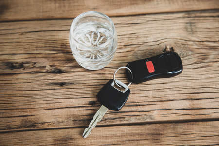 Glass of alcoholic drink and car key, on wooden table background.Alcoholic drink and car keys - do not drink and drive concept.