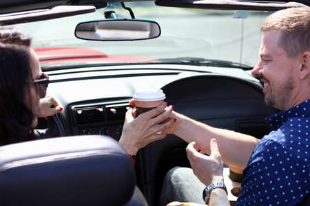 Man and woman are sitting in car smiling and holding glass of coffee.