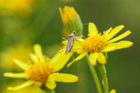 close up of a yellow ragwort and a Stenodema bug