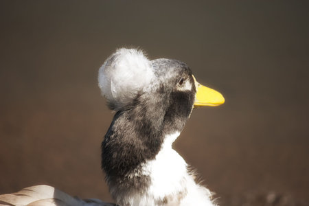 portrait of a bright duck with a gray head with a tuft and a yellow beak closeup