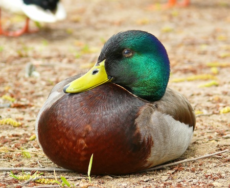 A sleepy male Mallard duck resting on the ground in Maryland