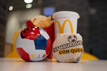 Bangkok, Thailand - November 19, 2022 : World cup collection from McDonald pleases football fans with a special World cup collection. get free for buy FIFA Burger Set, with 6 designs to choose from