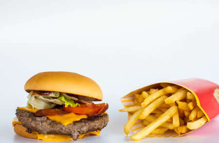 BELARUS, VITEBSK - OCTOBER 21, 2019: French fries and cheeseburger at mcdonalds close up