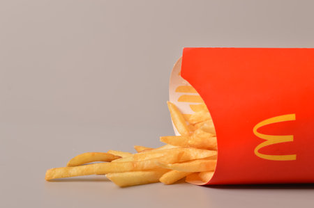 Bangkok, Thailand: McDonald's French fries in the French fries box on red background. McDonald's Corporation is the world's largest fast food restaurant - 04 May 2020