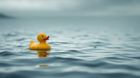 Bright yellow rubber duck floats on tranquil water under a cloudy sky during early morning hours