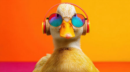 A fun and colorful scene shows a duck wearing stylish sunglasses and headphones. The backdrop features bright orange and pink hues creating a playful atmosphere.