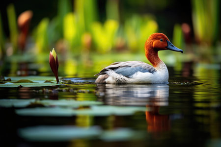 Duck swims gracefully in a tranquil pond during early morning sunlight in a serene natural setting