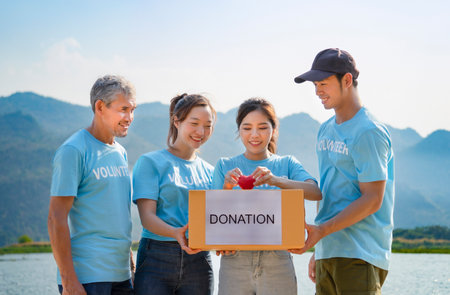 volunteers team gathering for charity foundation in the park by the pond, carrying donation boxes and a red heart for campaign to collect donation items