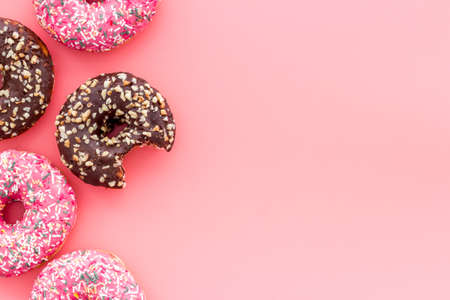 Chocolate, pink and vanilla donuts with sprinkles, sweet glazed dessert food on pink minimal background, top view